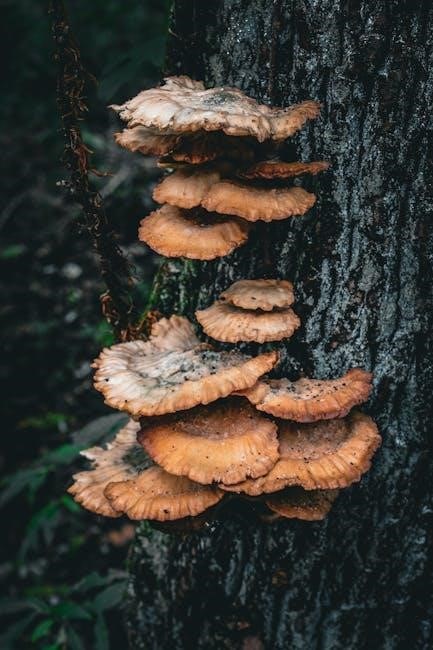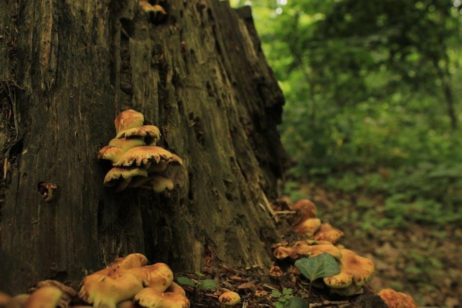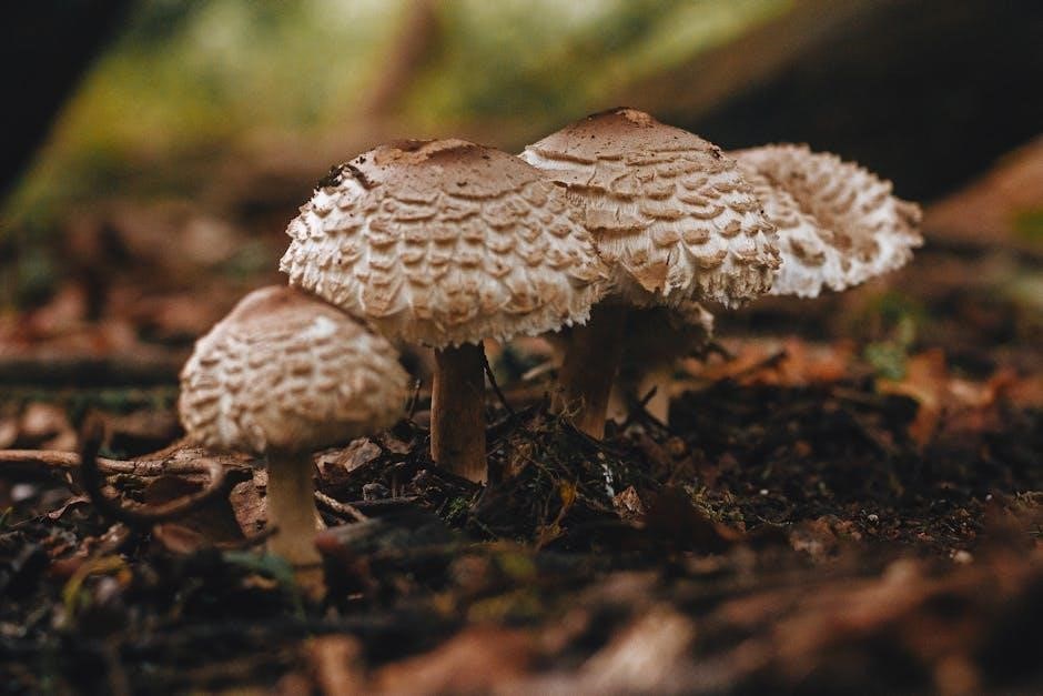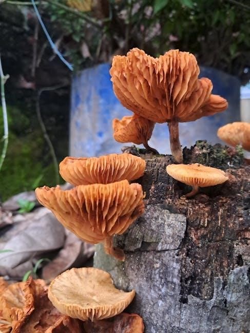 This section highlights prominent psilocybin species, including Psilocybe cubensis, known for its widespread cultivation, and Psilocybe semilanceata (Liberty Cap), found in European fields. Panaeolus cyanescens thrives in diverse habitats, while Gymnopilus spectabilis offers vibrant colors but lower potency. Each species exhibits unique traits, essential for accurate identification and appreciation of their ecological roles.
